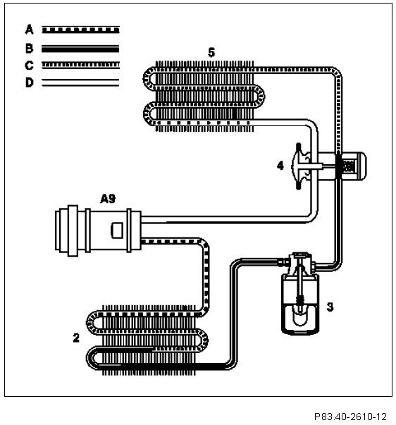 The refrigerant compressor (A9) which is driven by the engine compresses the refrigerant vapor, which heats up in the process. The refrigerant is conducted to the condenser (2). The surface of the condenser (2) is used to withdraw the compression heat from the refrigerant. The refrigerant liquefies during cooling. As it flows through the fluid reservoir (3) the refrigerant is cleaned of chemical and mechanical impurities. The cooled and liquefied refrigerant flows through the expansion valve (4) into the evaporator (5), which is located in the fresh-air flow. The refrigerant is then vaporized. Through this evaporation process heat is extracted from the fresh air flowing past from outside over the tube and fin system so that air cools down.