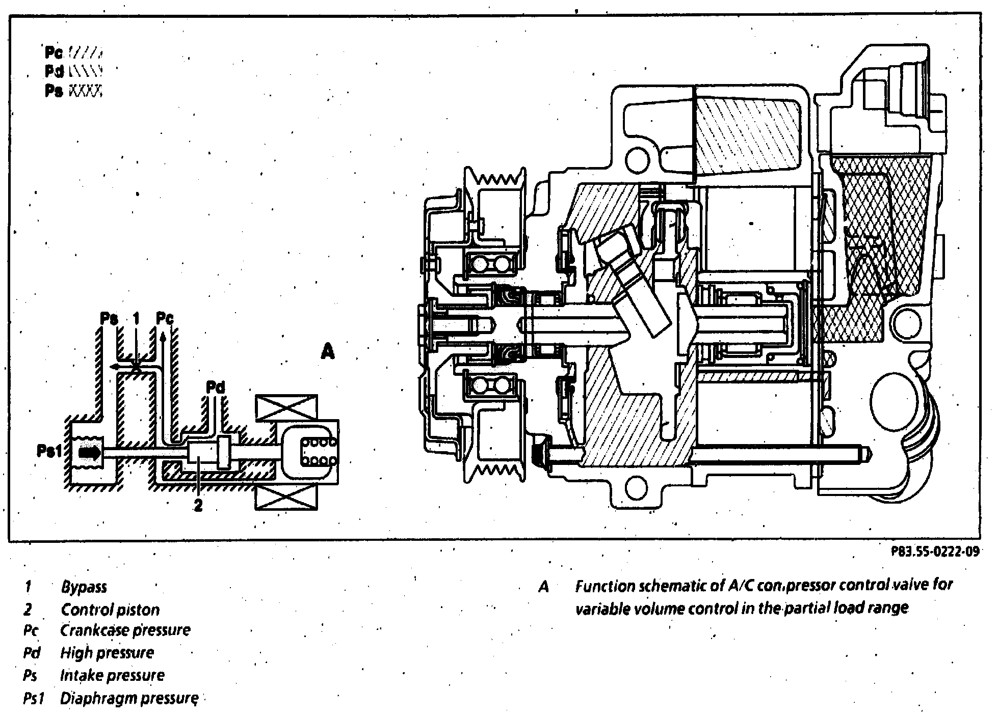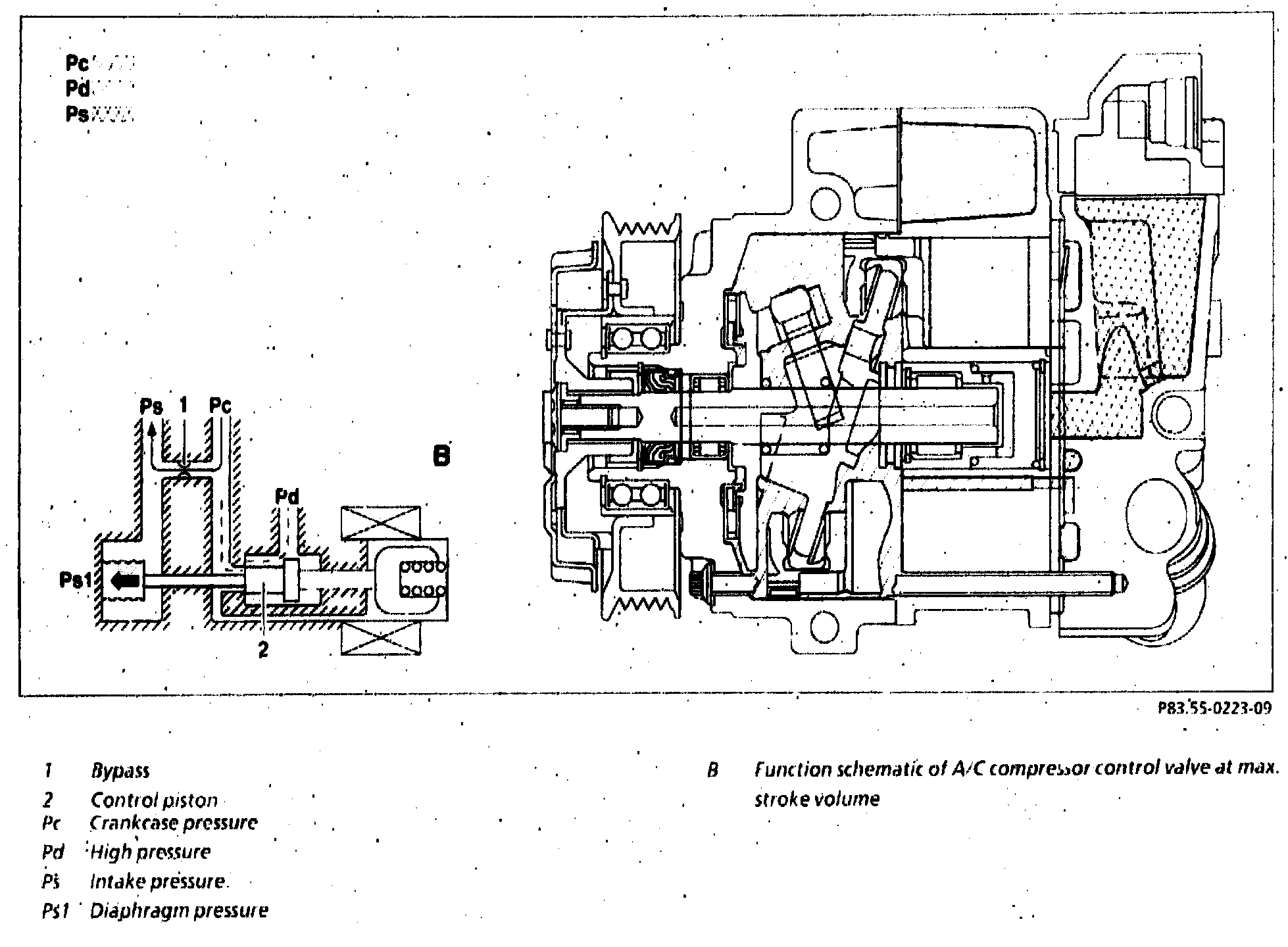 If the intake pressure (Ps) increases above the diaphragm pressure (Ps1) in the A/C compressor control valve and the control current is increased simultaneously, passage Pd to Pc in the A/C compressor control valve is closed by the control piston (2). The crankcase pressure (Pc) decreases because refrigerant cannot flow from the high pressure side (Pd) through the A/C compressor control valve into the crankcase.