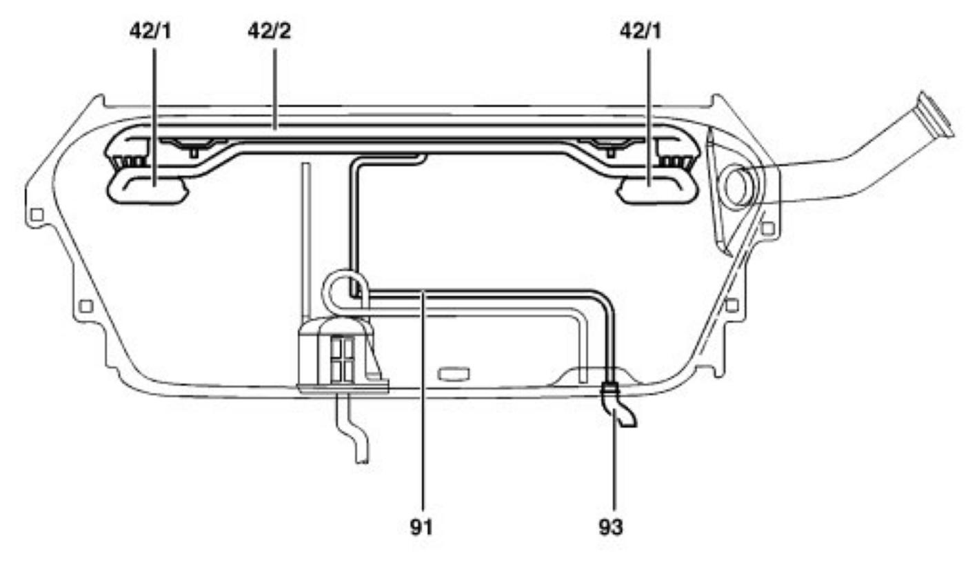 On vehicles fitted with a gasoline engine, the vent hose (93) runs to the activated charcoal canister. As of approx. 7/98 a vent valve is integrated in the vent line to the activated charcoal canister (without (USA)).