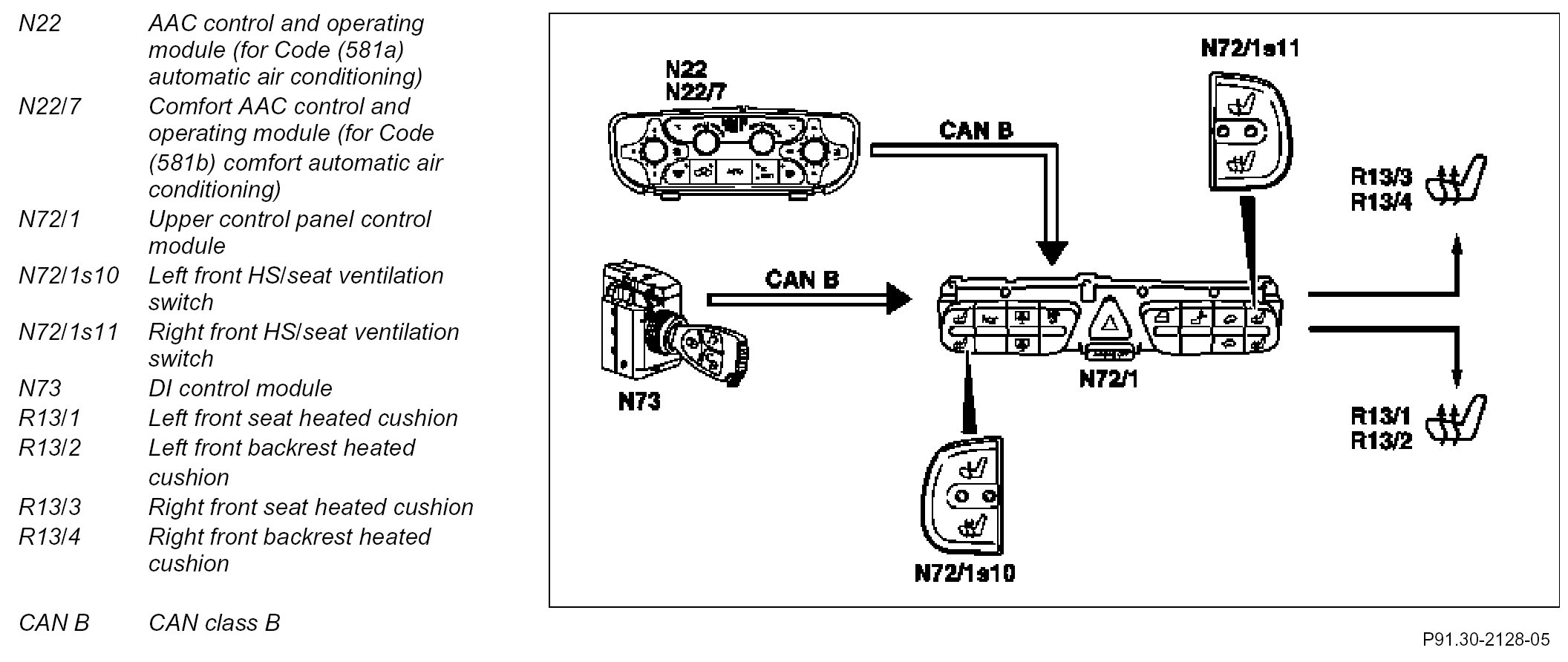 The upper control panel control module (N72/1) actuates the left front seat heated cushion (R13/1) and left front backrest heated cushion (R13/2) or the right front seat heated cushion (R13/3) and right front backrest heated cushion (R13/4), which are heated depending on the selected heating stage.