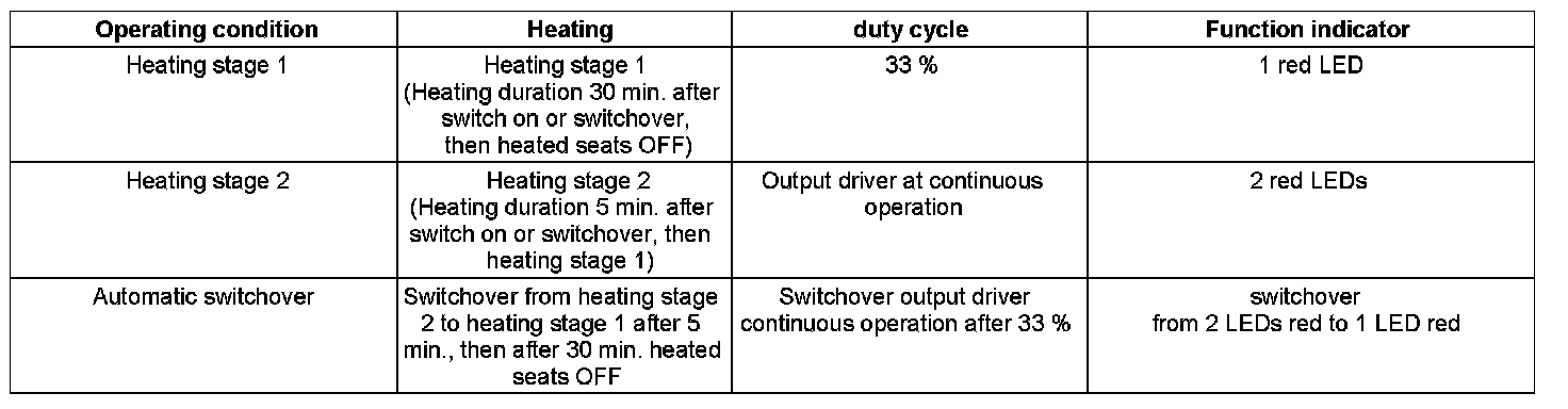The logic for the heated seats is integrated in the in the upper control panel control module (N72/1). A pulsed output, depending on the selected output stage, is outputted to the corresponding heating elements. See table shown below.