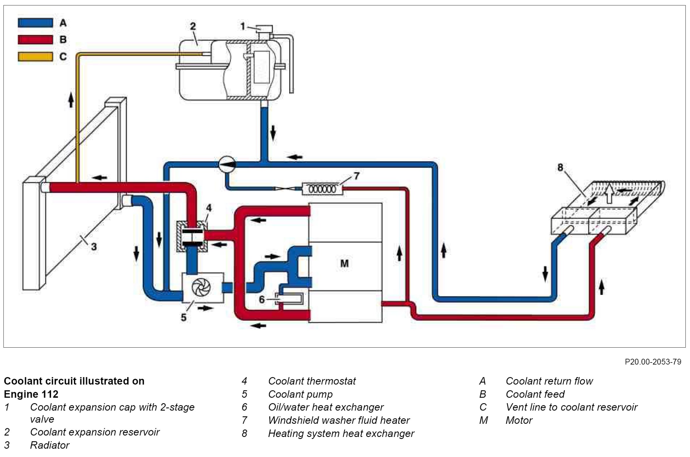 The coolant returns to the coolant pump (5) via the coolant return (A), in which the coolant circulation pump (on vehicles with code (670a) residual engine heat utilization system MRA and code (581b) comfort automatic air conditioning) is located. By far the larger part of the coolant does not flow through the heater, but from the engine (M) to the coolant thermostat (4). Depending on the water temperature, this conducts the water through the radiator (3) or directly to the coolant pump (5).