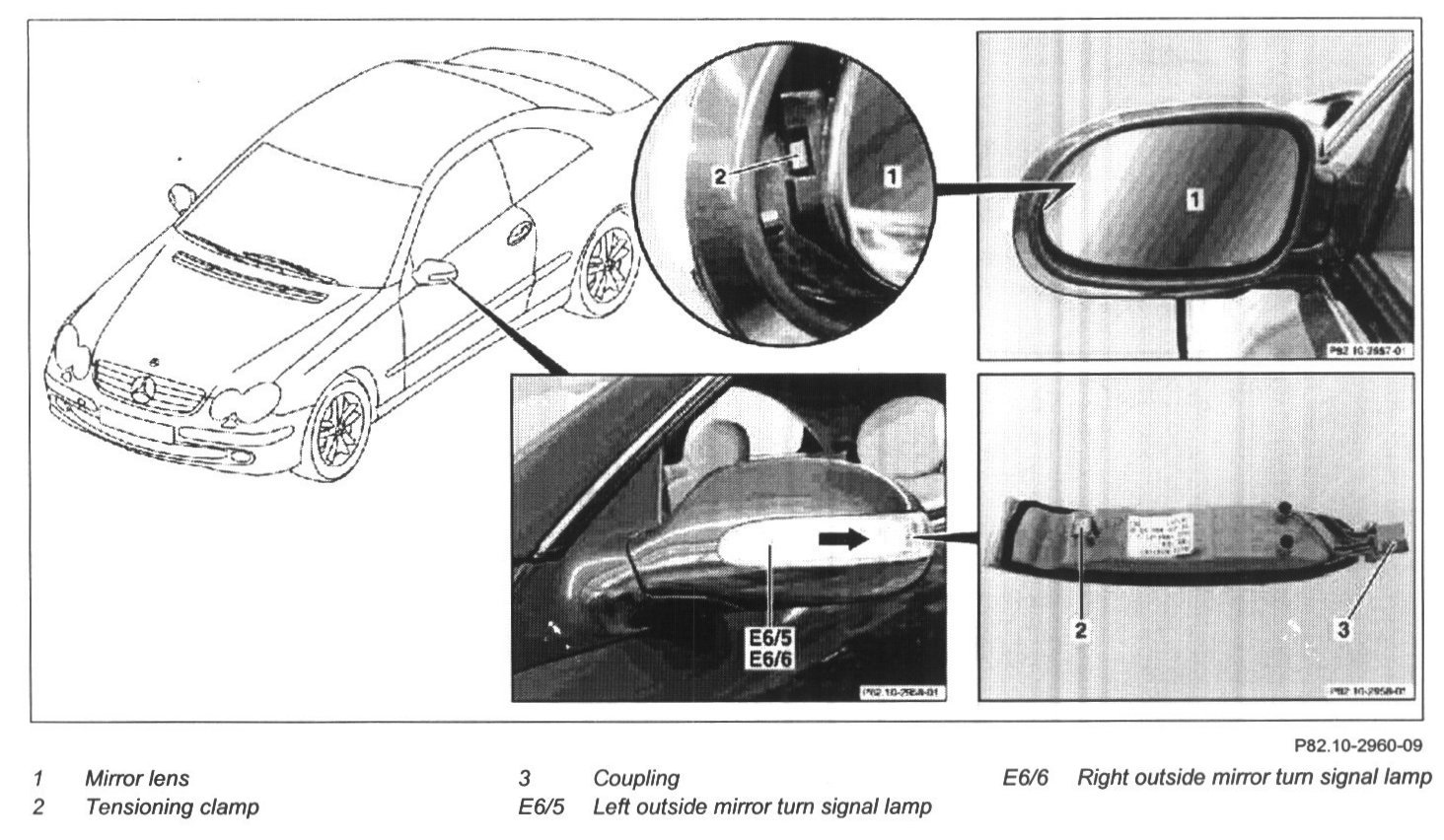4 Push left (E6/5) and right (E6/6) outside rearview mirror turn signal lamps outward and remove