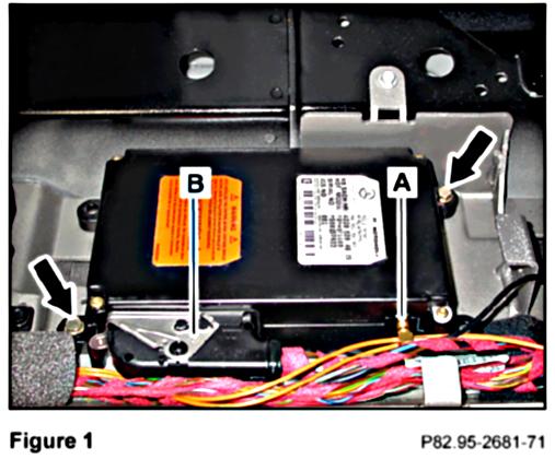 1. Remove the analog Tele Aid control module from the electronics tray behind the rear seat by removing the two M6 screws (Arrows, Figure 1).