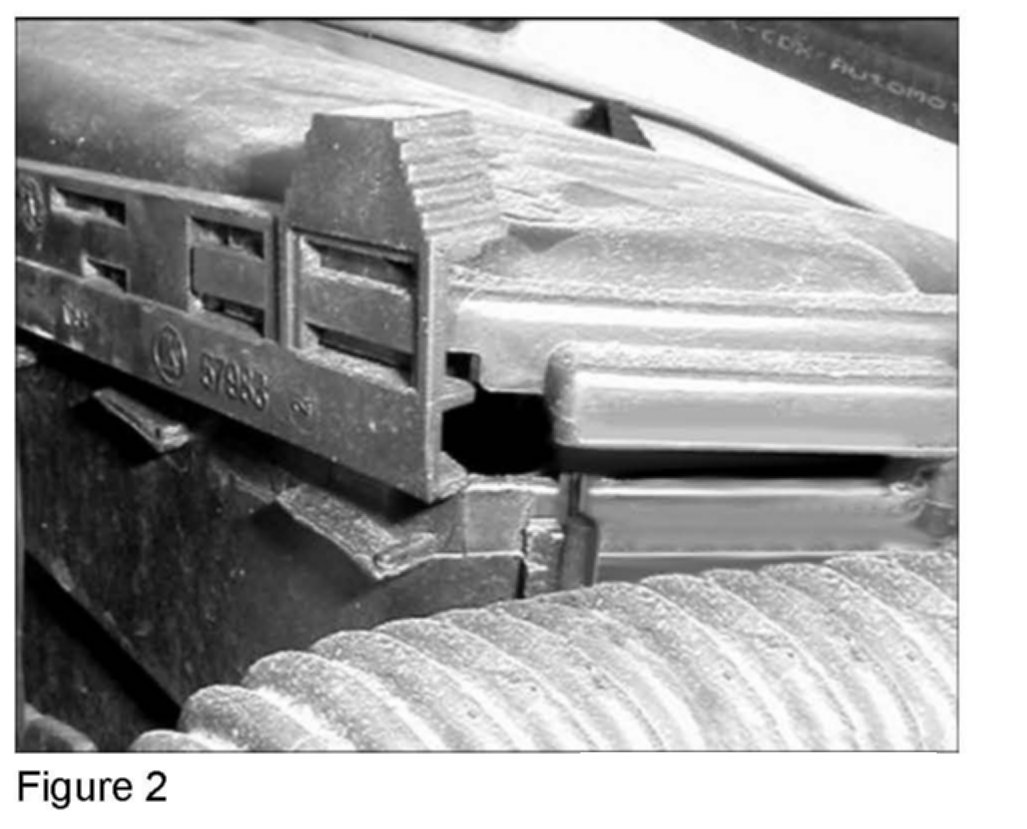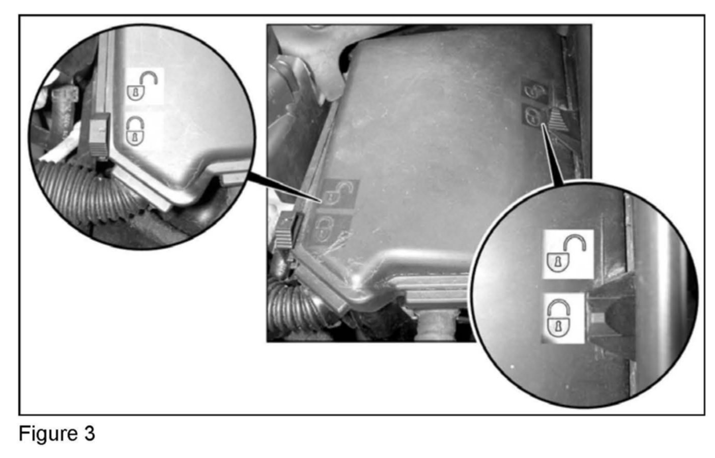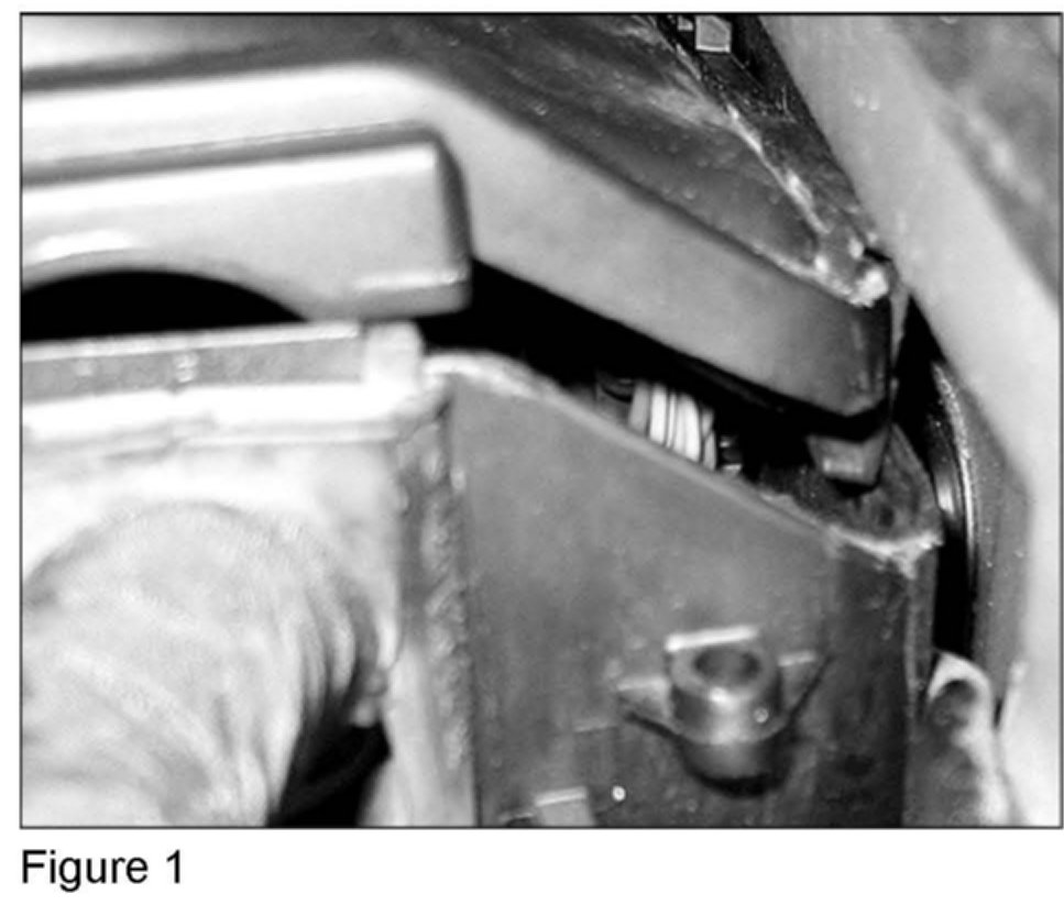 1. Reinstall the cover and check whether it engages correctly all the way around the wall of the module box. Figure 1 depicts module box on fender side installed incorrectly. Figure 2 depicts module box on the engine side installed incorrectly.