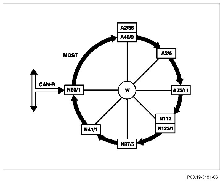 The radio or the COMAND operating, display and control unit forms the interface (gateway) for data exchange between the MOST and CAN-B. The central gateway control unit (N93) is the interface for data interchange between the CAN B bus and CAN C bus. At the same time, it is the interface via CAN-D to the data link connector X11/4), in order to test the control units connected to the different bus systems using STAR DIAGNOSIS.