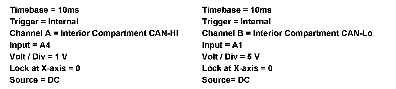 Voltage readings differ when measuring CAN-B bus activity with a multimeter or a conventional oscilloscope. CAN-High has an approximate voltage of 0.025 volts at rest and 0.65 volts when communicating. CAN-Low has an approximate voltage of 11 volts at rest and 4.65 volts when communicating.