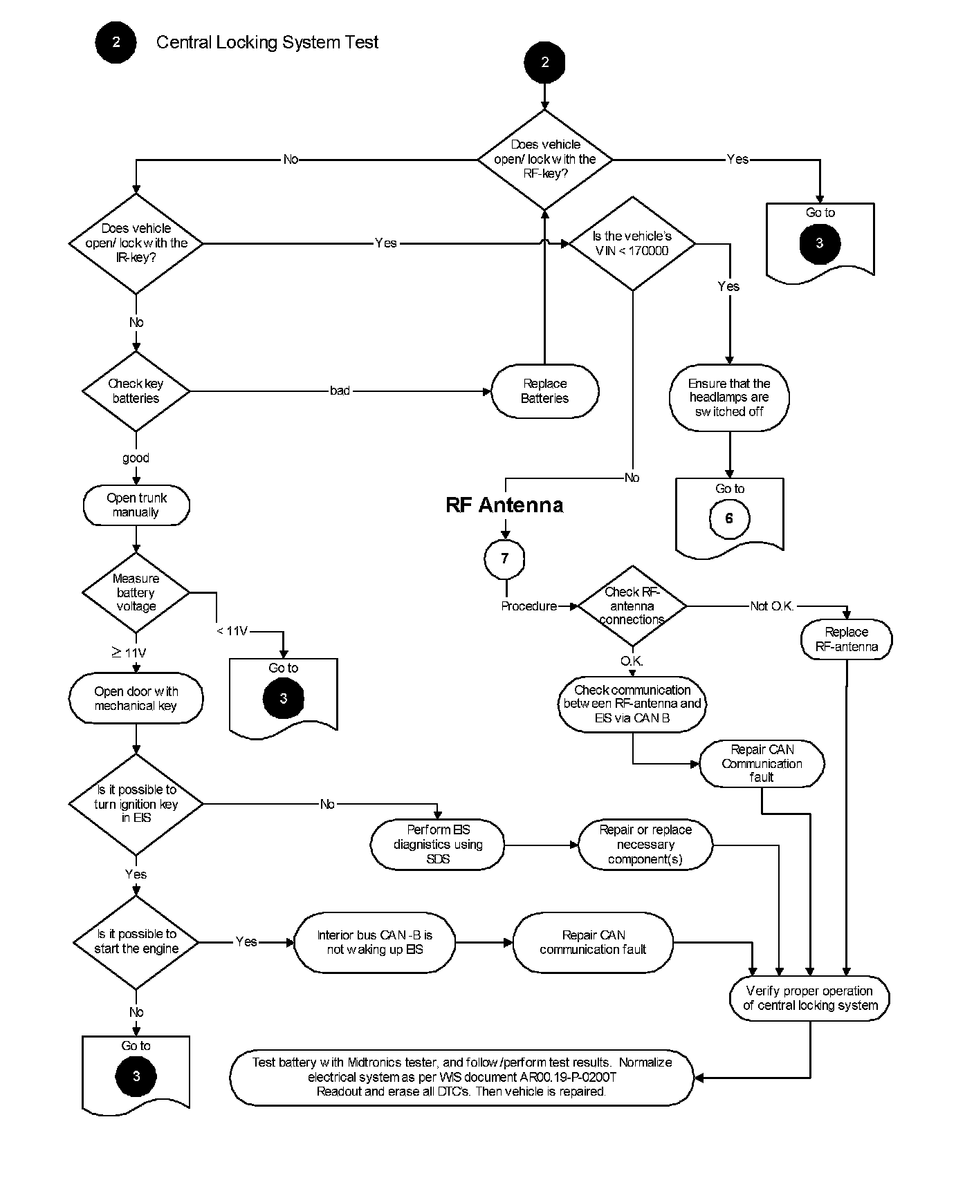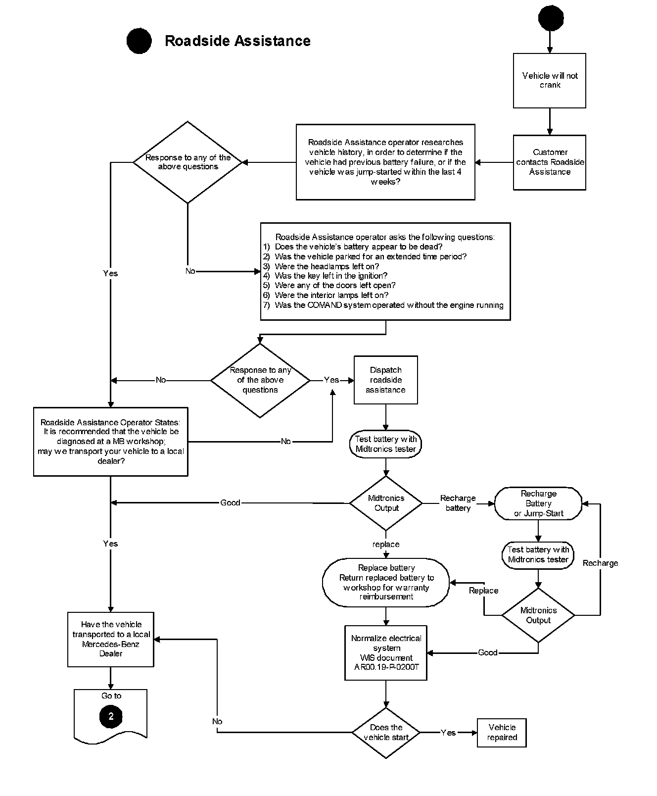 Have the vehicle transported to a local authorized Mercedes-Benz dealership workshop for further diagnostics if remote repair is not possible. The workshop technician should begin troubleshooting using diagnostic flow chart # 2 Central Locking System Test" The technician should also perform the procedure outlined in diagnostic flow chart # 4 "Control Module Isolation For Rest Current Measurements Procedure."
