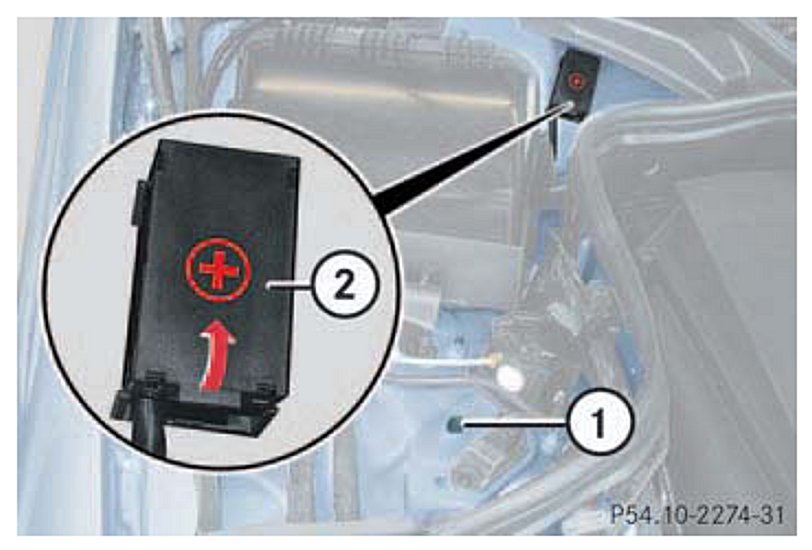 - Remove the jumper cables first from negative terminals (1) of the batteries and then from the positive terminals (2).