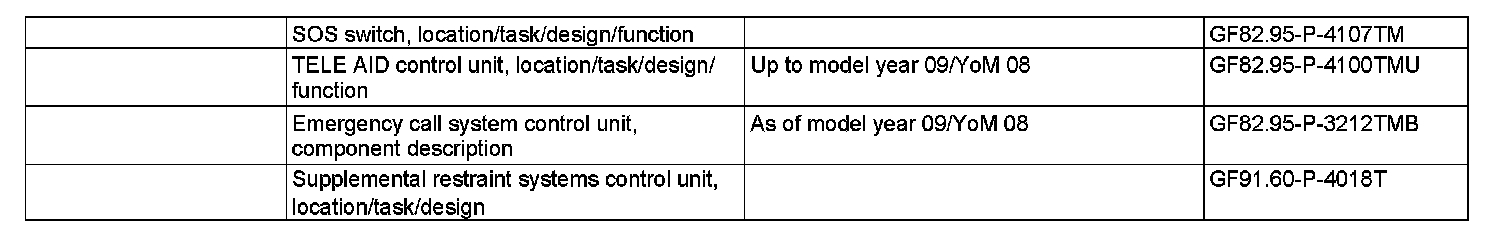 The emergency call system control unit (N123/4) receives the messages listed below via a direct digital crash signal from the restraint systems control unit (N2/7) and additionally (redundantly) via Control Area Network bus class D (diagnosis) (CAN-D) from the central gateway control unit (N93). The central gateway control unit receives the message from the restraint systems control unit via the Controller Area Network bus class B (interior) (CAN-B):