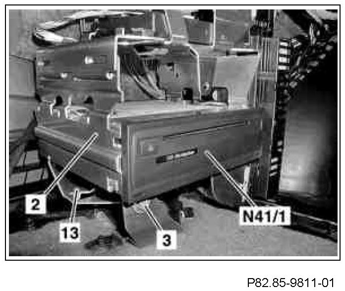 5 Push control unit bracket (2) with navigation processor (N41/1) into guide for bracket (13) as far as the stop.