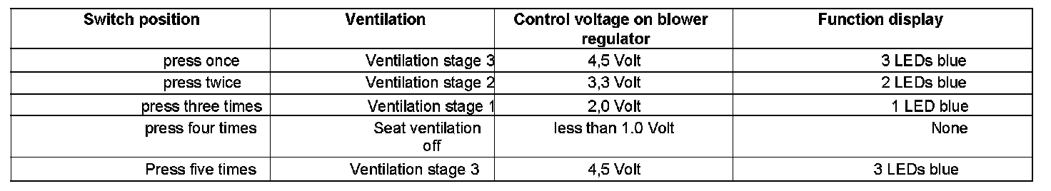 Operation and function indicators of the seat ventilation are summarized in the table given below.