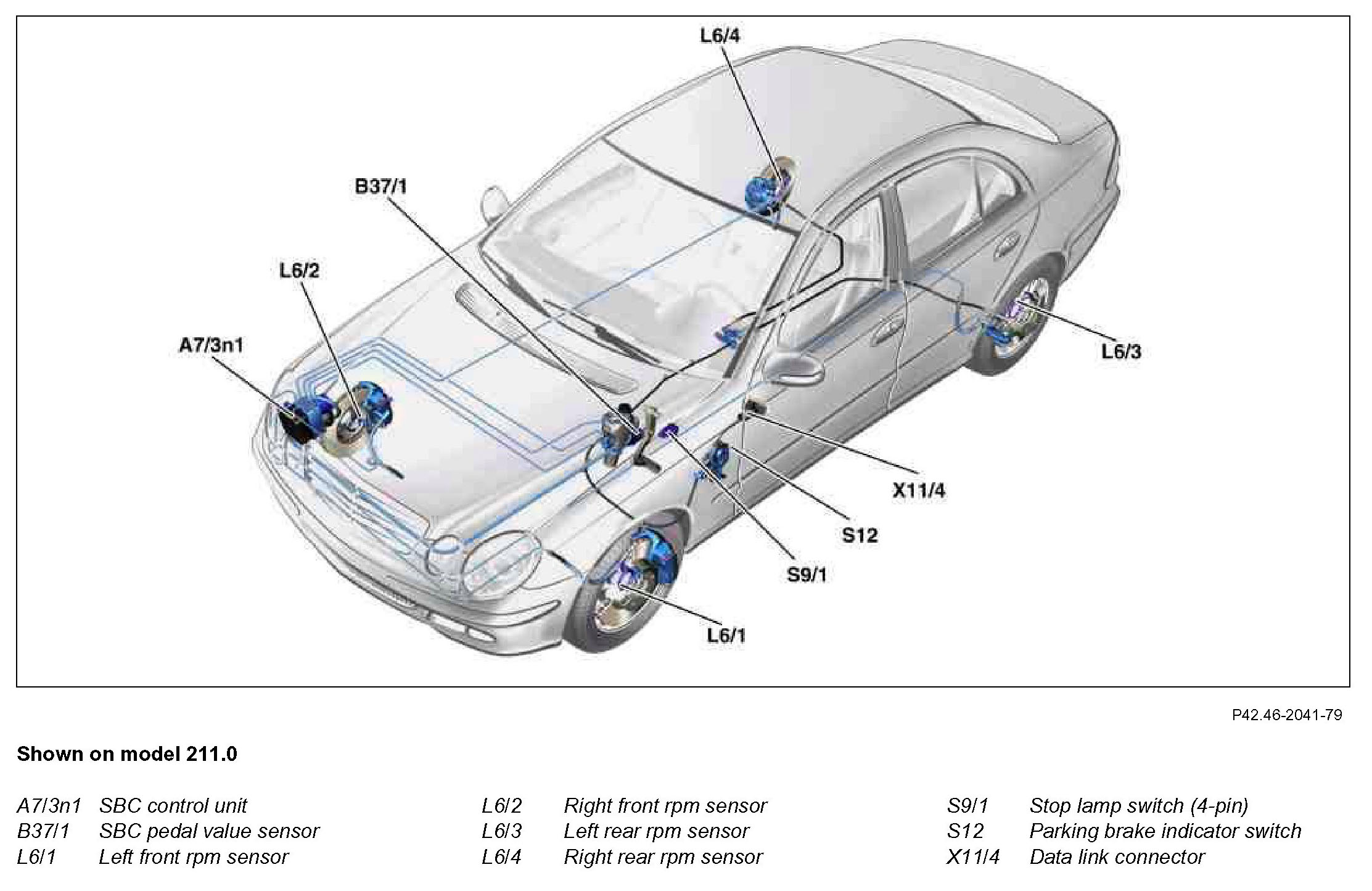 A7/3n1 The driver's brake actuation is transmitted electronically to the SBC control unit via the SBC pedal travel sensor.B37/1 The brake pressures calculated by the ESP, SPS [PML] and BAS control unit (N47-5) are allocated individually to the individual wheel brakes via the SBC hydraulic unit (A7/3).