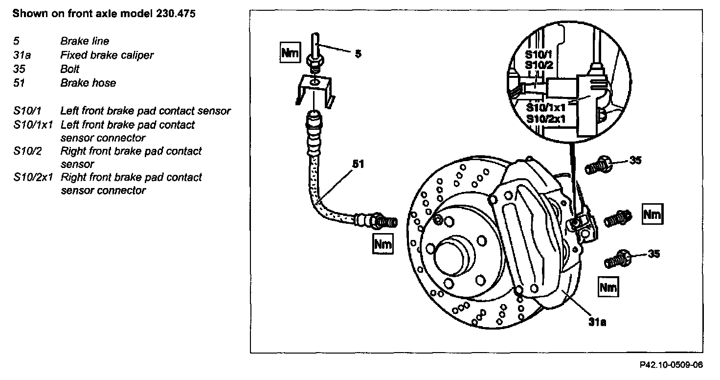 4 Detach left front or right front brake pad contact sensor (S10/1, S10/2) from left front or right font brake pad contact sensor connector (S10/1x1, S10/2x1)
