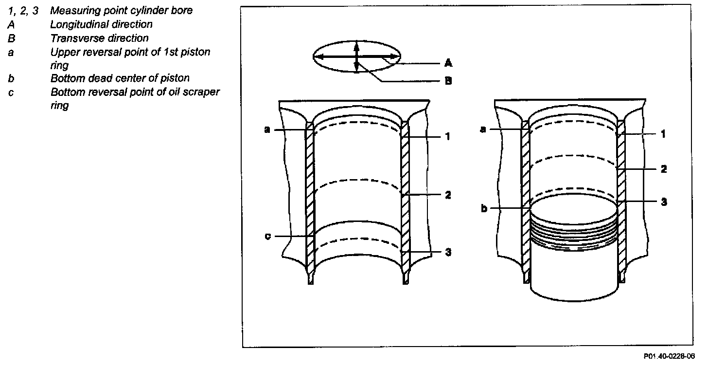 - Measure diameter of the cleaned cylinder bores with an internal measuring instrument in the longitudinal and transverse directions.