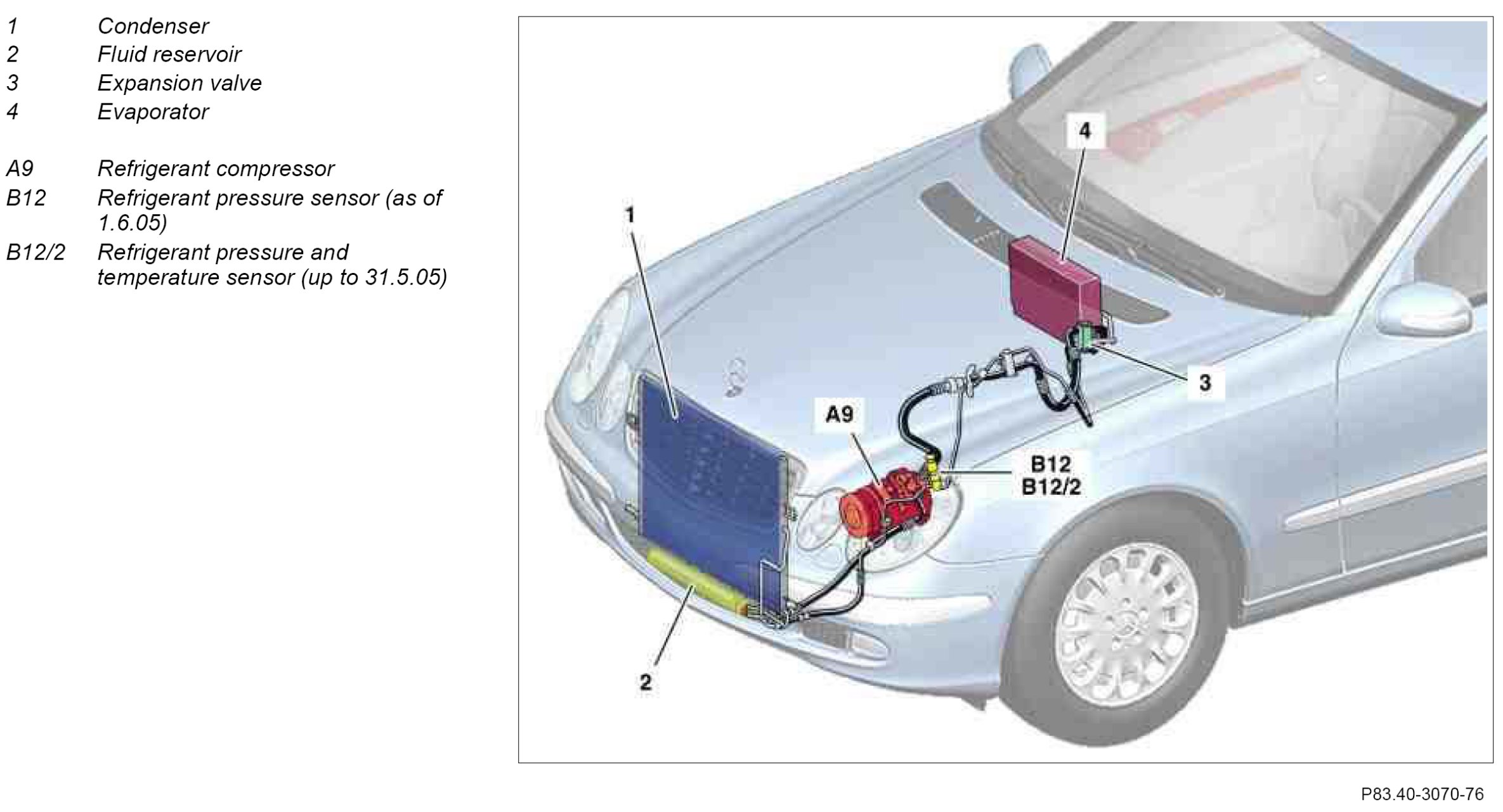 The pressure and refrigerant temperature sensor (B12/2) monitors the pressure and temperature of the refrigerant.