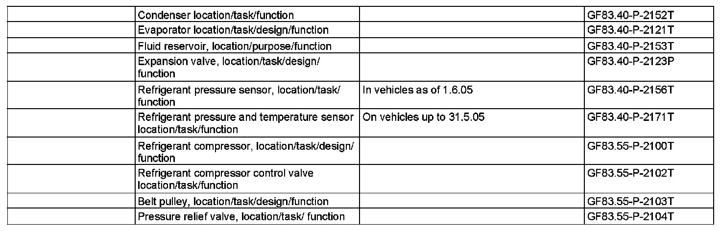 The cooled and liquefied refrigerant flows through the expansion valve (3) into the evaporator core (4), which is located in the fresh- air flow. The refrigerant is then vaporized. Through this evaporation process heat is extracted from the fresh air flowing past from outside over the tube and fin system so that air cools down.