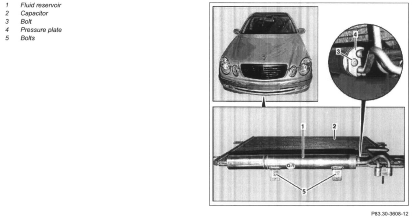 4 Unscrew screws (5) and remove fluid reservoir (1) from condenser (2)