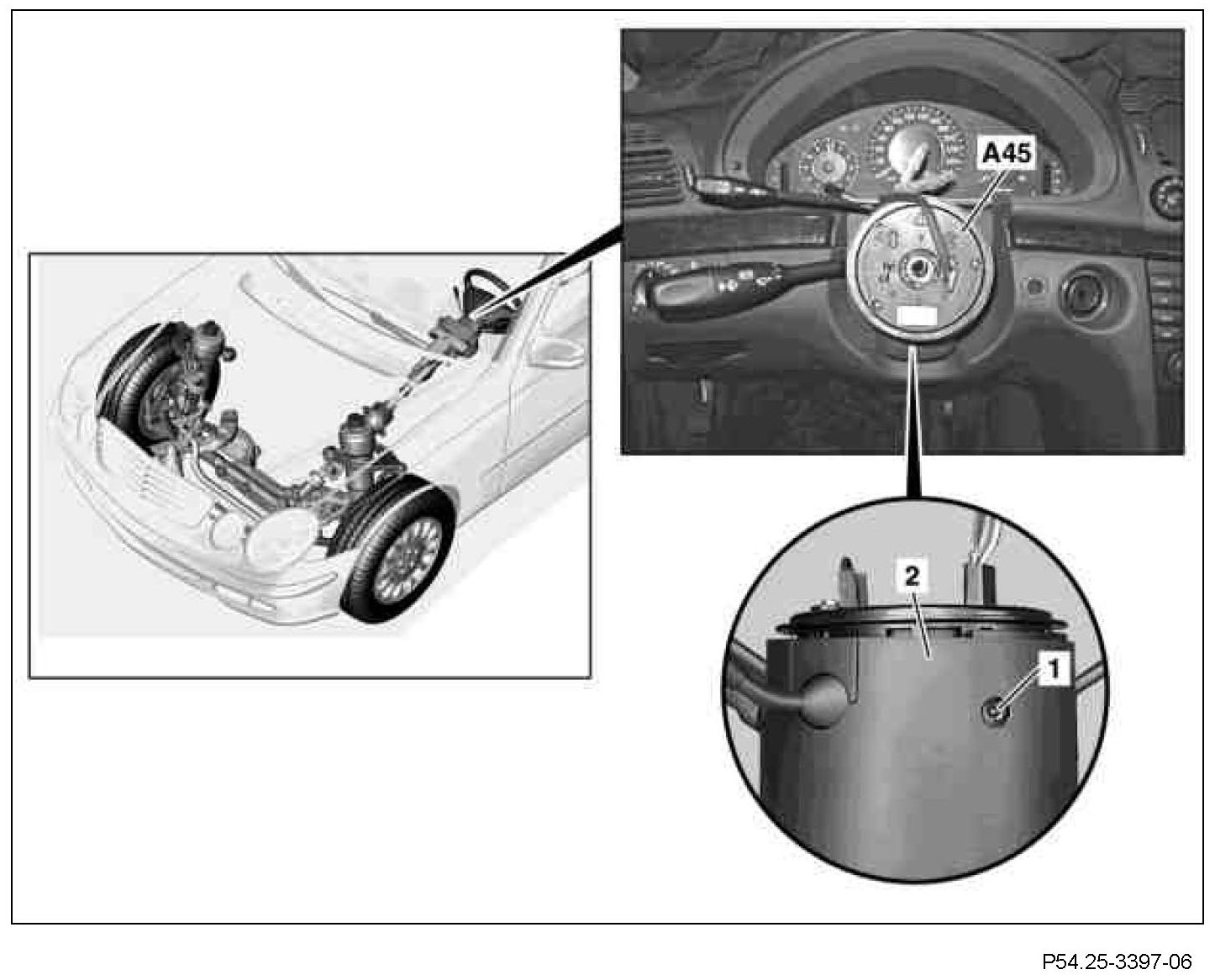 When the steering wheel is detached the fanfare horns and airbag clock spring contact (A45) must not be twisted otherwise this can be damaged.