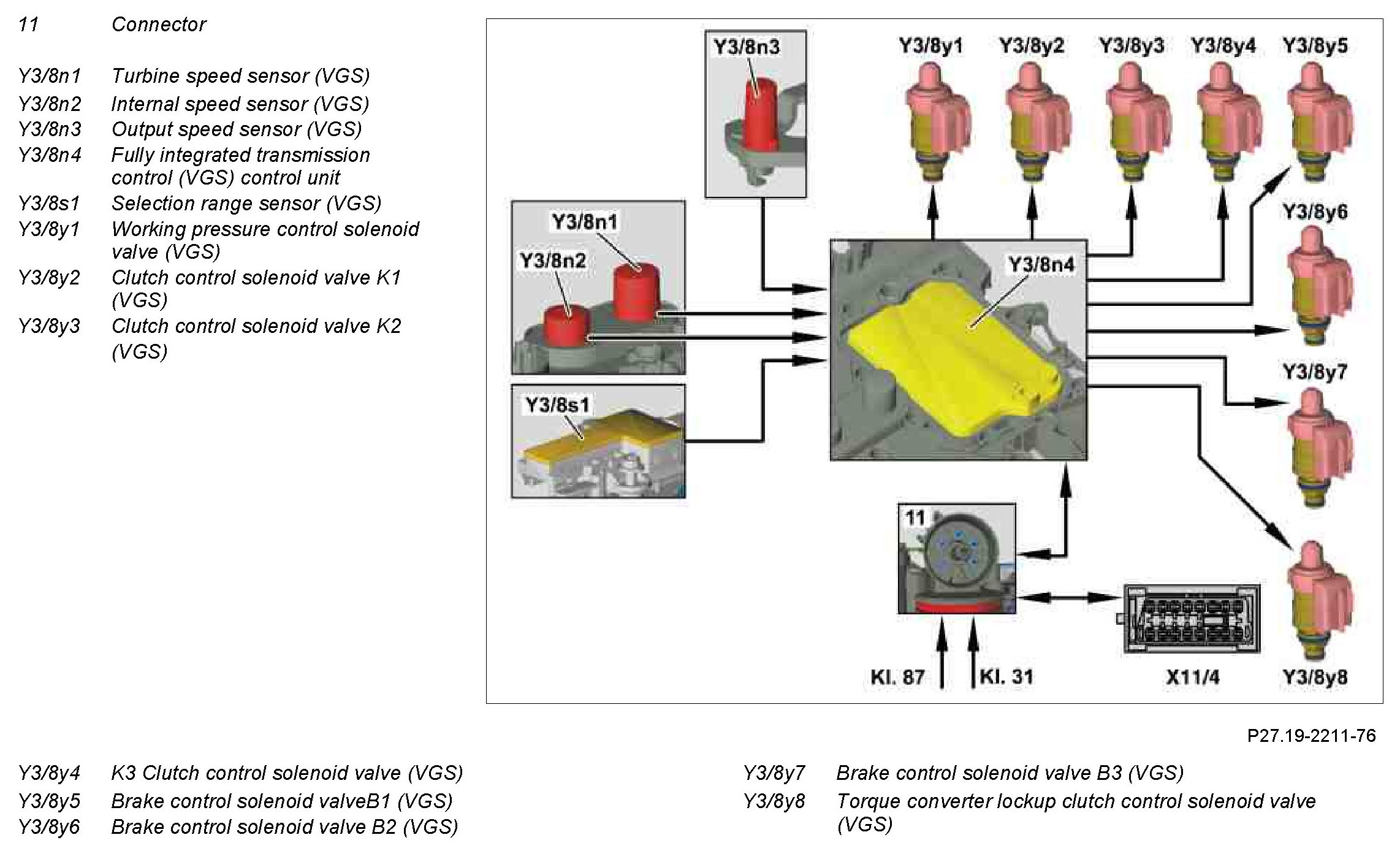 The control solenoid valves listed are actuated by the fully integrated transmission control (VGS) control unit (Y3/8n4) and trigger the hydraulic functions: