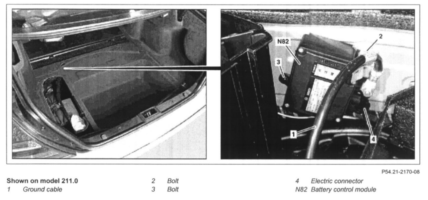 6 Connect multimeter between ground line (1) and battery control module ground point (N82)