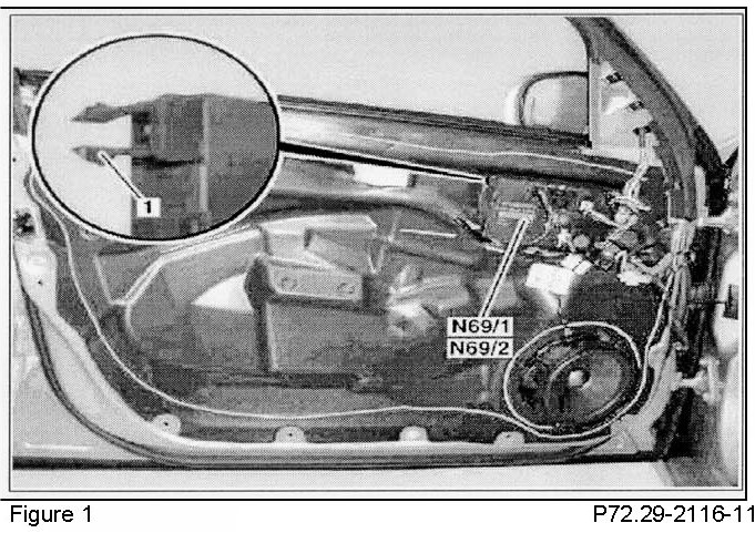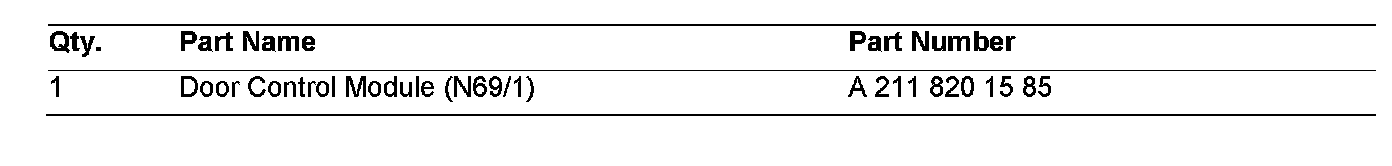 DCAG has determined that in certain Model 211 vehicles, the left front door control module (N69/1) (Figure 1) may have to be replaced after determining that the listed functions" may not be performed properly: Window lift, exterior mirror adjustment, trunk lid unlocking, comfort closing (window closes with remote control) and seat adjustment.