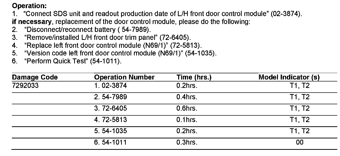 5. After installing the replacement left front door control module, it must be version coded using the Star Diagnosis system (SDS), by transferring the version coding to the new door control module (as done in Step 2 above).