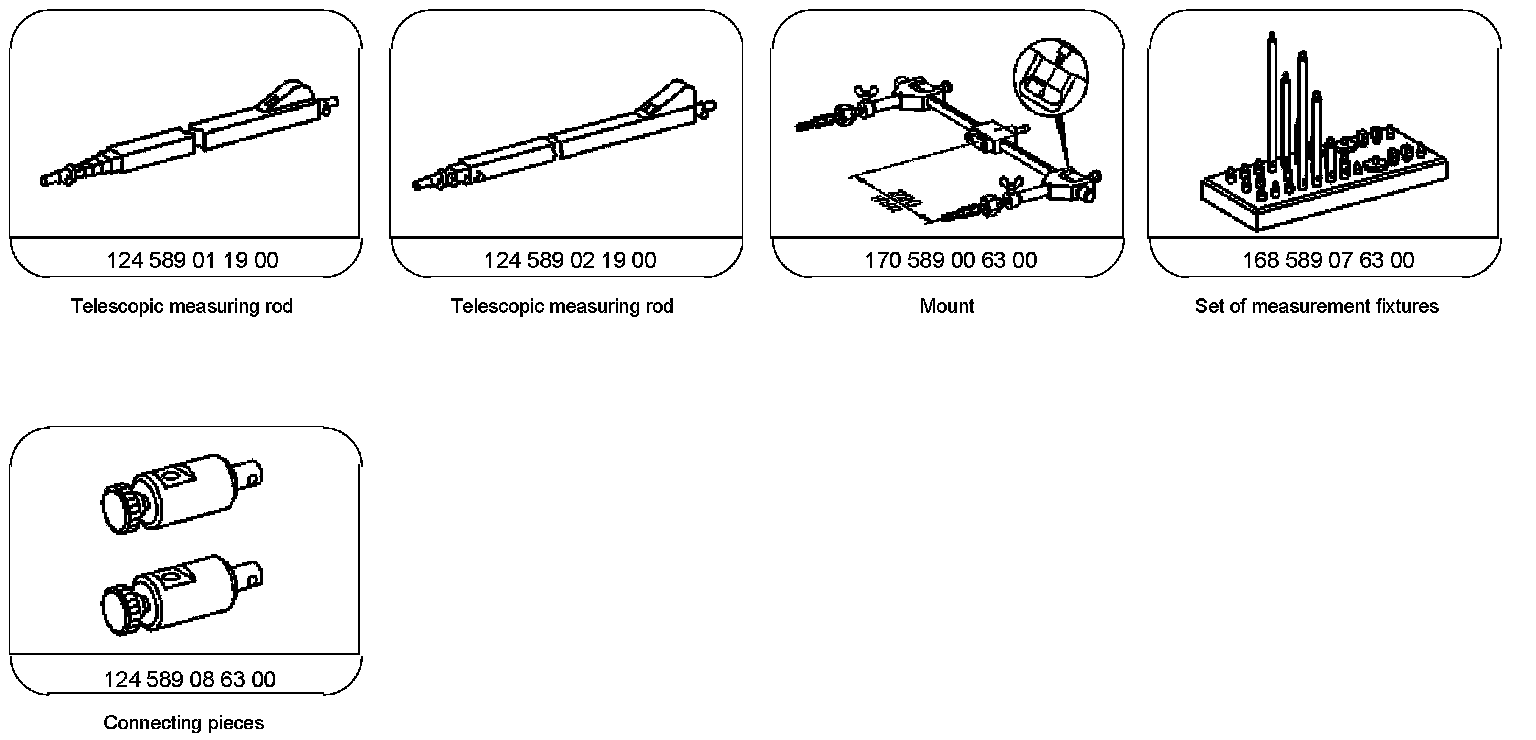 The measuring set is designed in such a way, that the measuring bolts, according to the measuring points at the vehicle, can be screwed together out of mounting bolts, extensions and measuring tips/bolts.