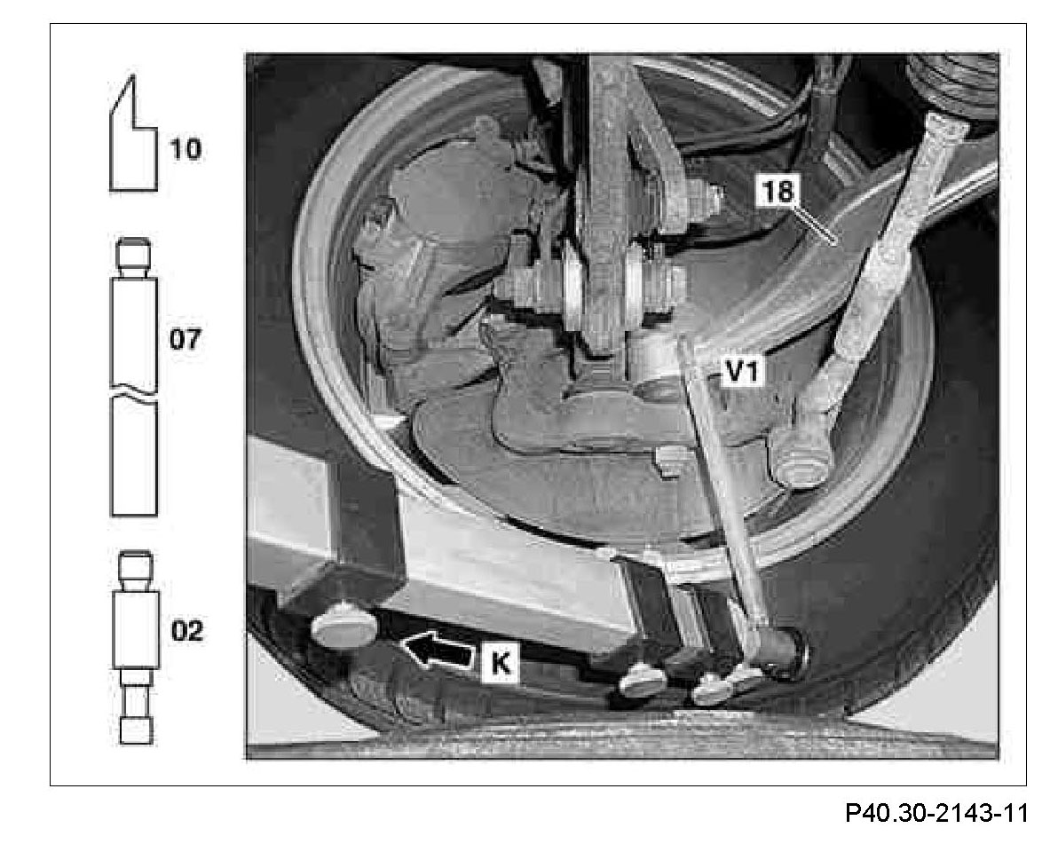 1 Measure comparative measurement (V1) from the check point (K) to the cast surface on the torque strut (18). Measure on the left and right side in each case.
