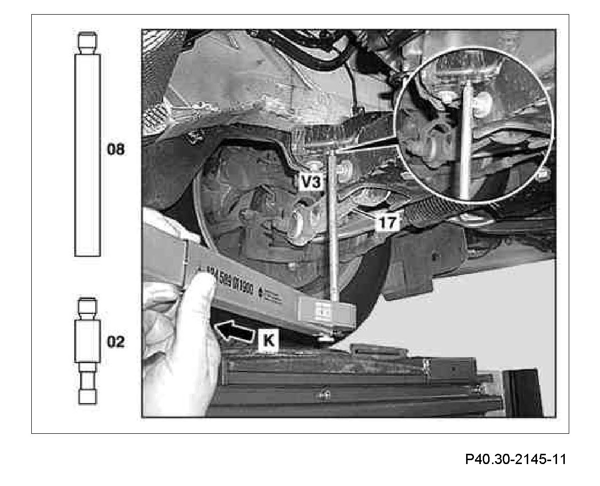 3 Measure comparative measurement (V3) from the check point (K) to the centering point of the mounting bolt of the spring control arm on the front axle carrier. Measure on the left and right side in each case.
