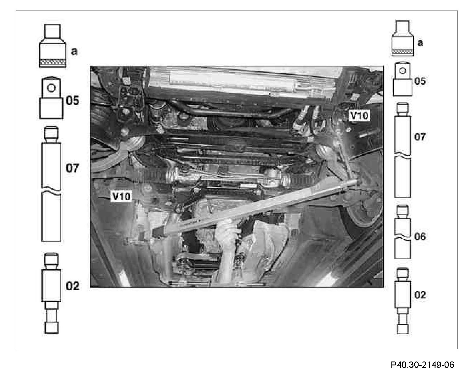 7 Measure distance dimension (V10) diagonally from the centering point of the Torx bolt heads between the front and rear mount of the front axle carrier, left to right.