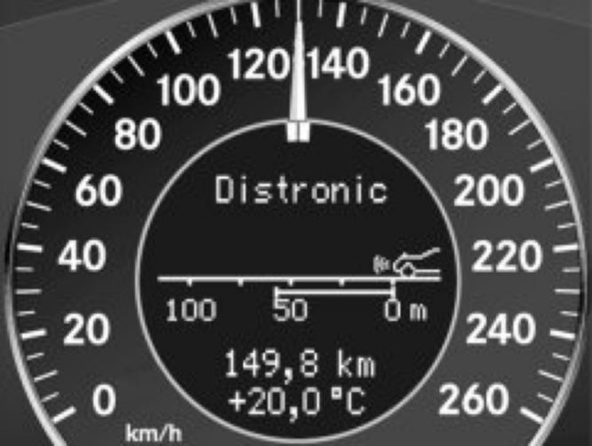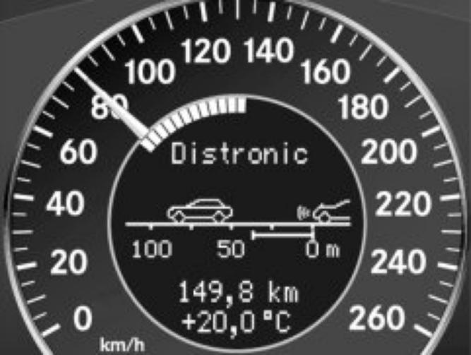 If the Distronic is activated, for example, at 130 km/hour, only one or two segments in the area of the stored speed of 130 km/hour light up in order to indicate the set speed to the driver.