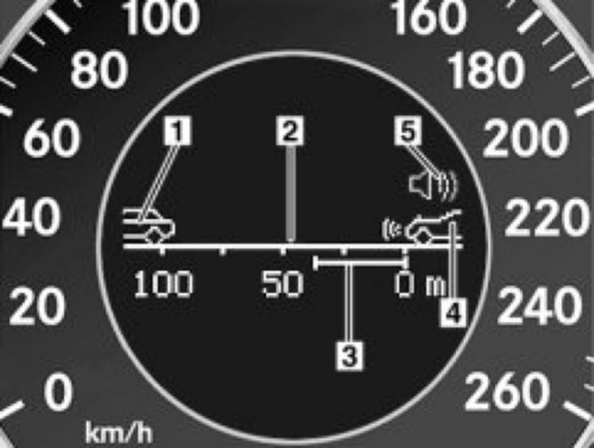 If the Distronic detects a slower vehicle ahead, a second vehicle (1) appears at the left-hand edge of the screen, which moves slowly across the distance scale. At the same time, the Distronic reduces the speed of its own vehicle until the selected specified distance is reached.