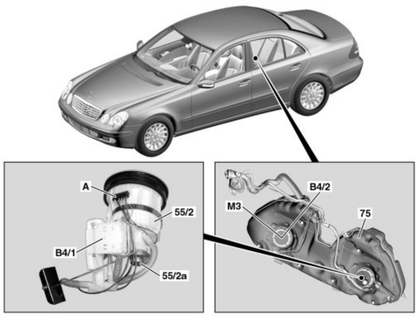 Each fuel tank chamber has one fuel level sensor (float-and-lever sensor with two wiper contacts). Both voltage signals (resistance values) are transmitted separately to the rear SAM control unit with fuse and relay module, which processes the corresponding signals and transmits them via CAN databus to the instrument cluster.