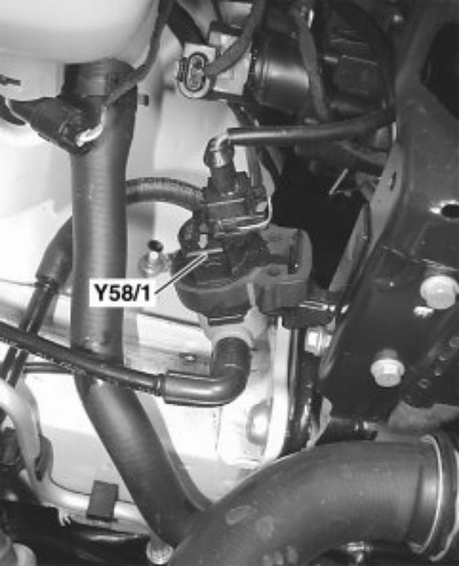 The purge control valve is located at the left front of the engine compartment below the coolant expansion tank.