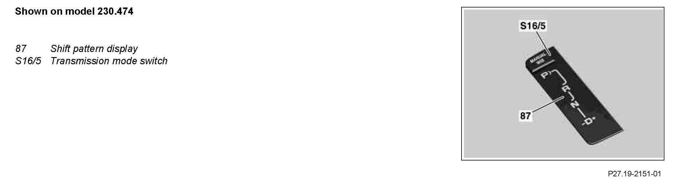 The program selection performed at the transmission mode switch (S16/5) remains stored after driving for approx. 1 minute and is then displayed again once the engine is started. The driving time required of approx. 1 minute is due to the system.