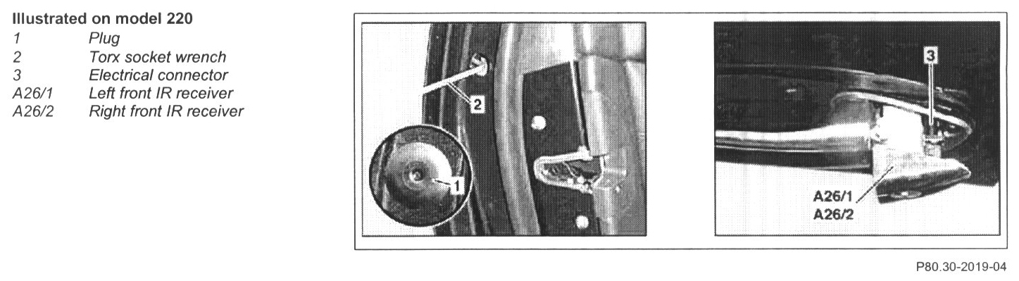 2 Unscrew mounting screw for left front IR receiver (A26/1) with Torx socket wrench (2)