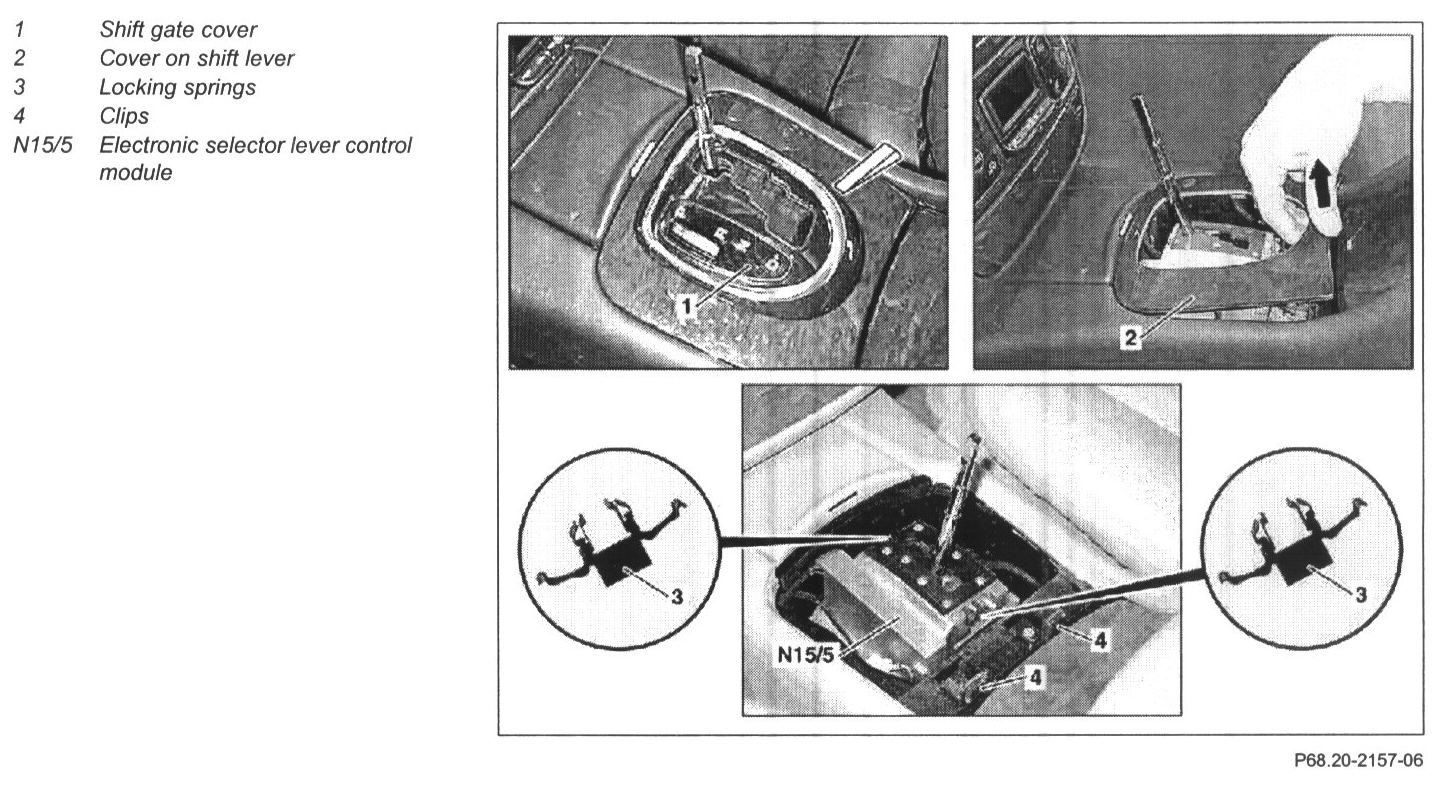NOTE: Installation: Ensure that locking springs (3) are fastened correctly in electronic selector lever control module (N15/5)
