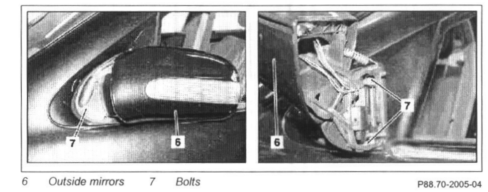 1 Fold down outside rearview mirror (6) so that screws (7) are accessible