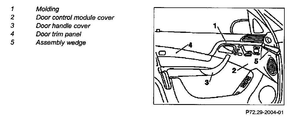 3 Press molding strip (1) from door control module cover (2) off with assembly wedge (5)
