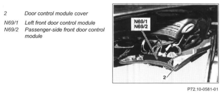 6 Disconnect heated outside rearview mirror connectors and outside rearview mirror adjustment connector at door control module (N69/1, N69/2)