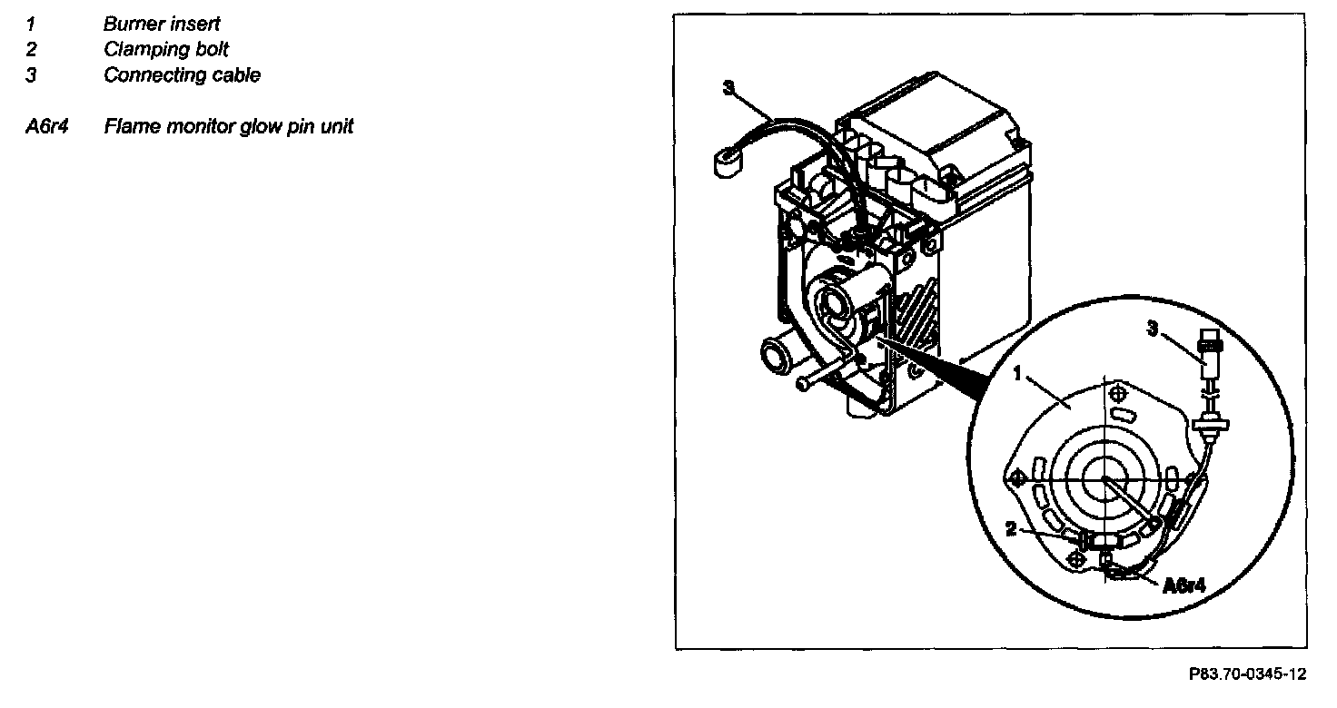 The heater element is inseparably integrated into the flame monitor heater element unit (A6r4). The flame monitor heater element unit (A6r4) is inserted into a mounting on the burner insert (1).
