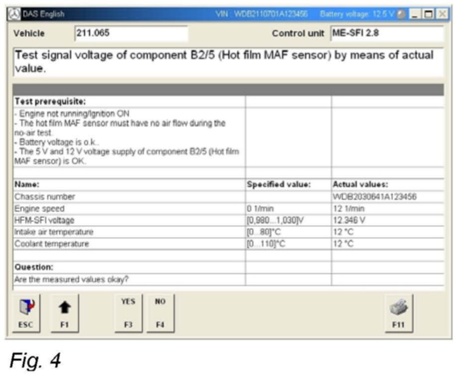 If the status of the relevant actual value is out of range from the specified value and all test requirements were fulfilled, replace the mass air flow sensor and send this part with the required DAS original printouts to our Quality Evaluation Center.
