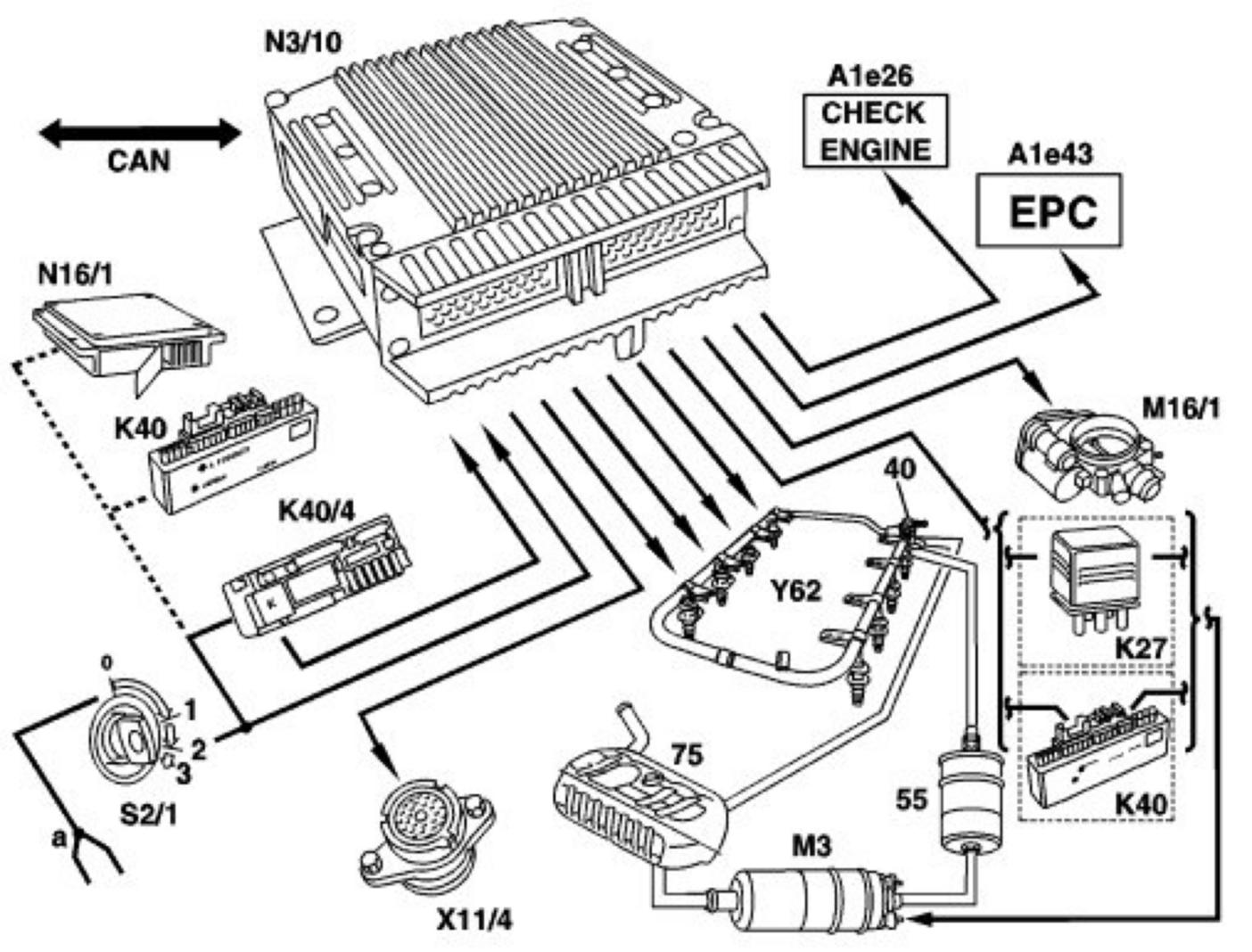 - Supply the fuel injection and ignition system ME via the base module (N16/1), relay module (K40) or the fuse and relay module (K40/4, K40/7 or F1) with voltage.