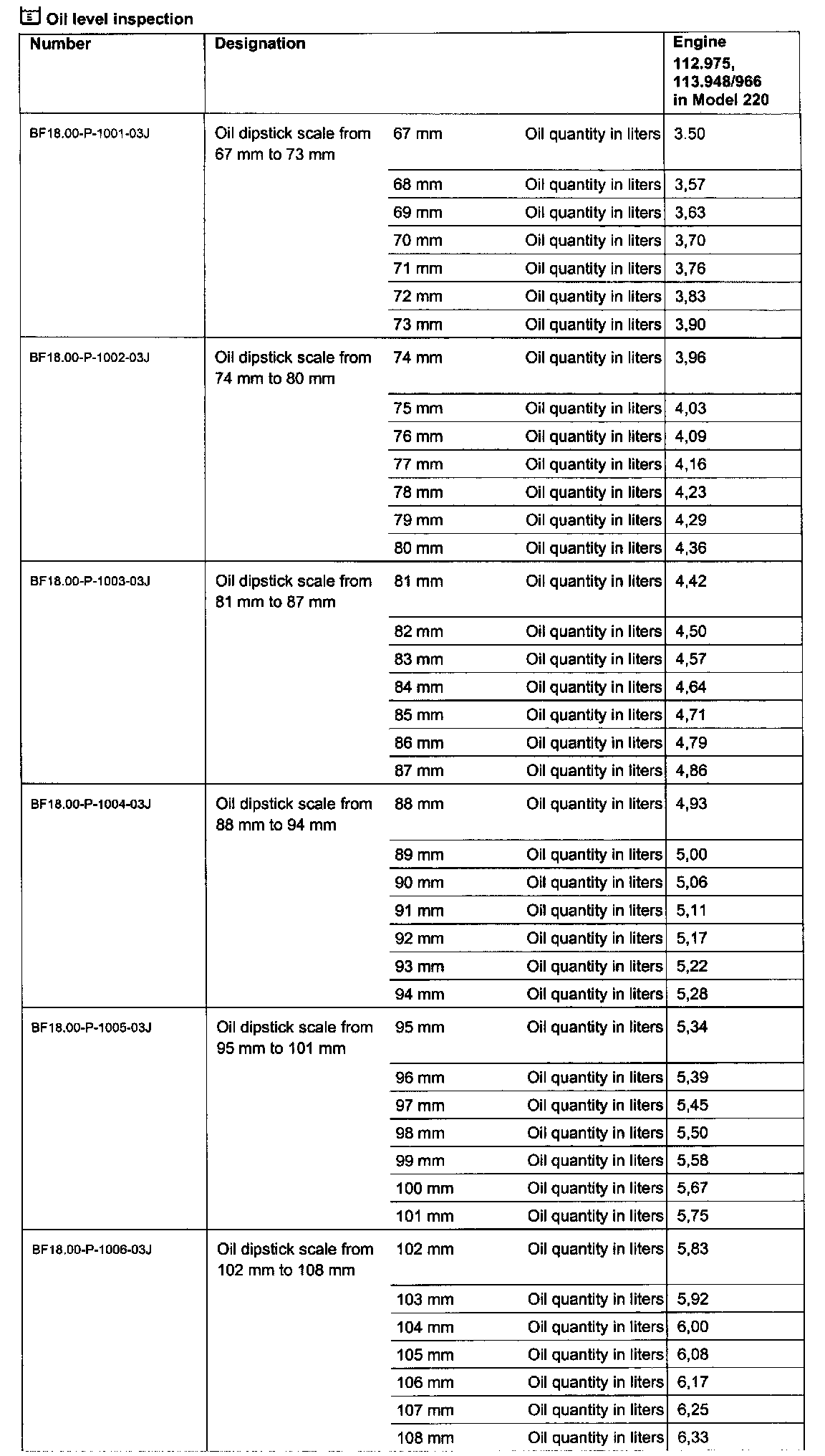 Oil dipstick scale from 67 mm to 108 mm: