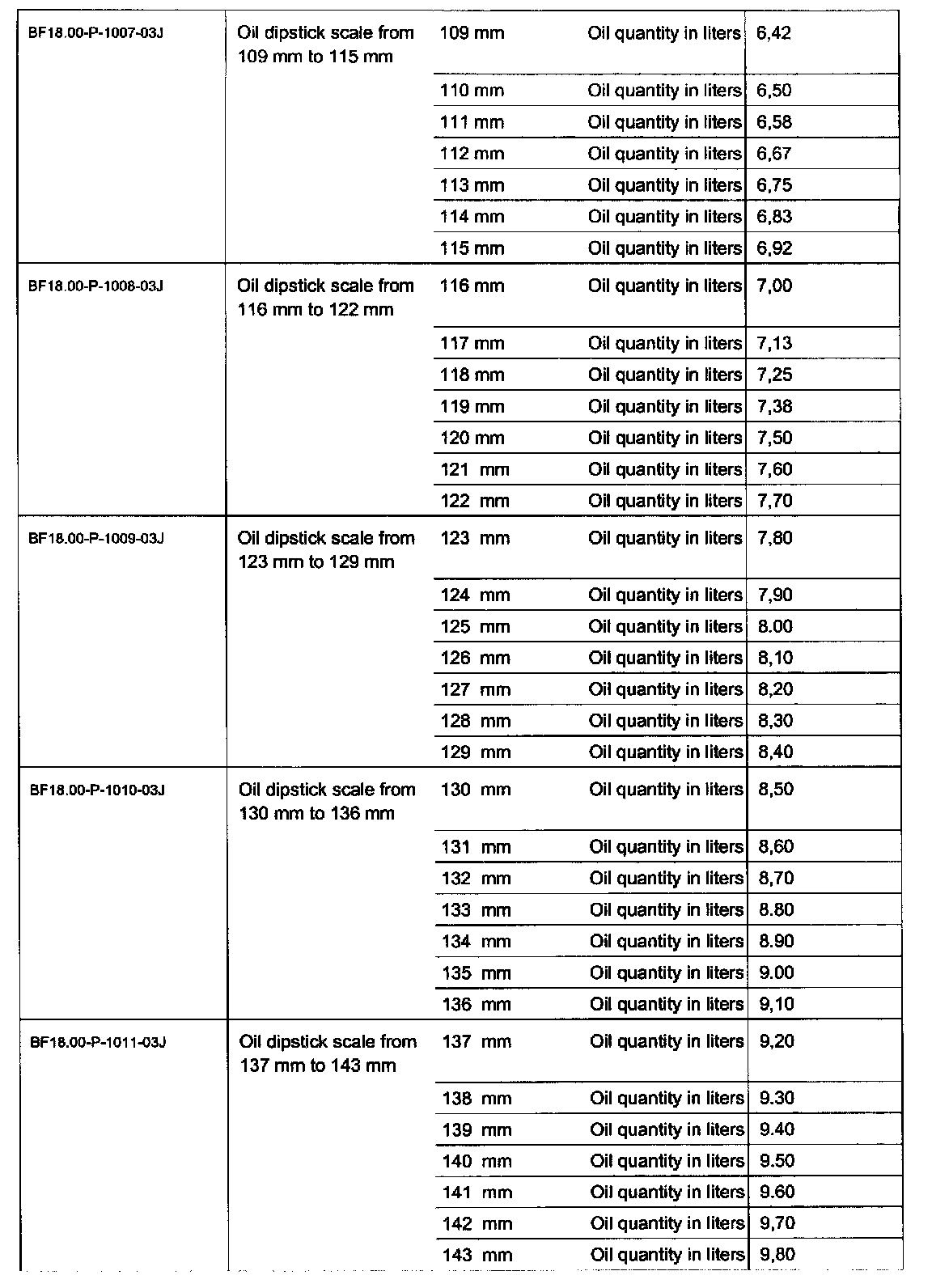Oil dipstick scale from 109 mm to 143 mm: