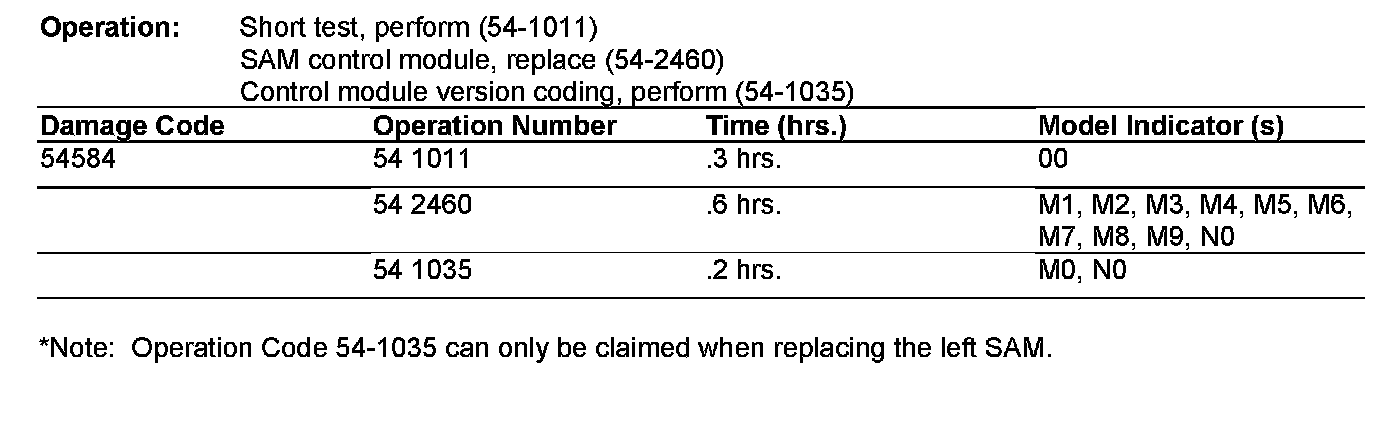 6. Verify that the SAM control module's part number is older than 032 545 82/83 32, and replace the SAM control module. Reference WIS document AR54.21-P-1260| for left SAM and AR-54.21-P-1261| for right SAM.