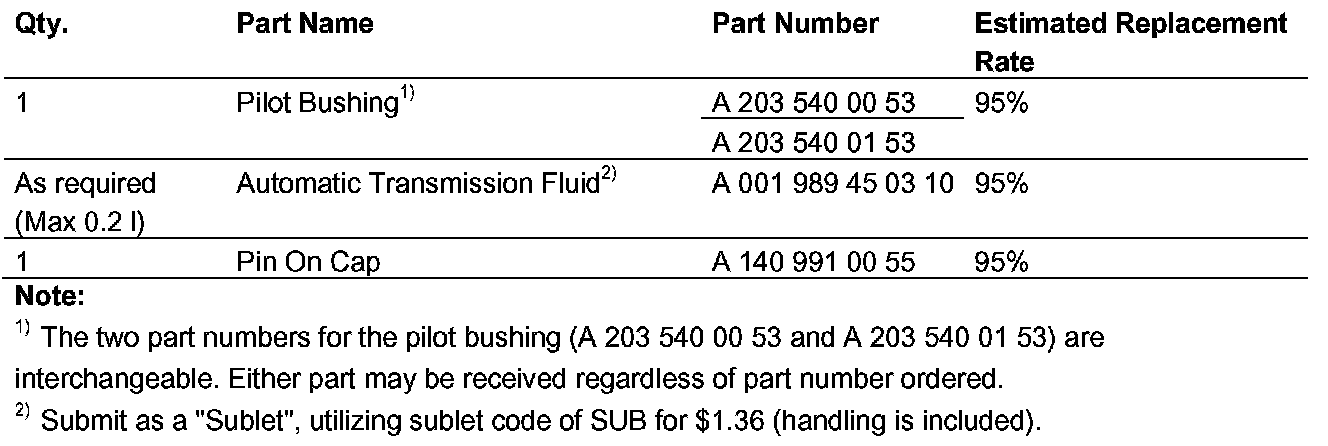 This service campaign has been initiated because DCAG has determined that on affected vehicles with 722.6 automatic transmissions (see VIN range below) the transmission pilot bushing may have been installed on the control units with non-tempered sealing rings which may cause a small leak to occur. Dealer will inspect the pilot bushing for a color marking and replace if necessary.