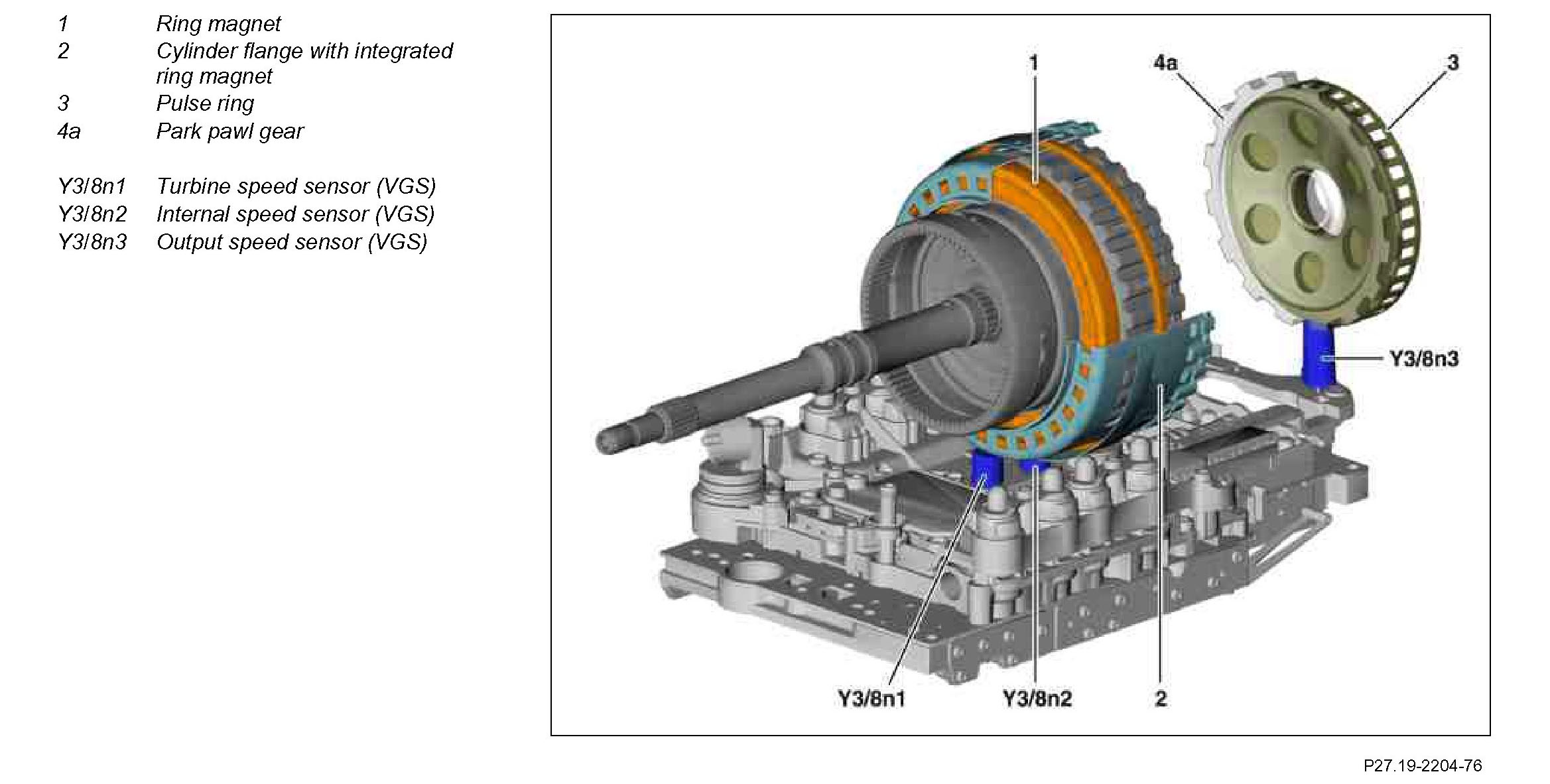 The transmission output speed is recorded using a pulse ring (3) and a Hall difference sensor. This increases the measuring accuracy. 2 Hall generators and a bar magnet are integrated into the output speed sensor (VGS) (Y3/8n3). Magnetic field changes occur due to the rotary motion of the pulse ring (3).