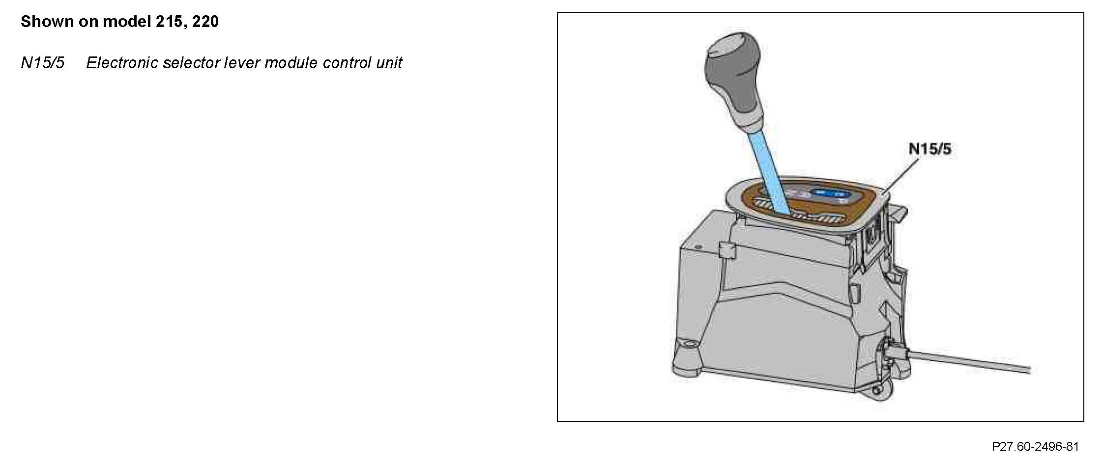 The selector lever is guided and positioned in the shift gate. All selector lever positions are recognized by the electronic selector lever module control unit (N15/5), then coded and forwarded via the Controller Area Network bus Class C (engine compartment) (CAN-C) to the fully integrated transmission control (VGS) control unit (Y3/8n4).